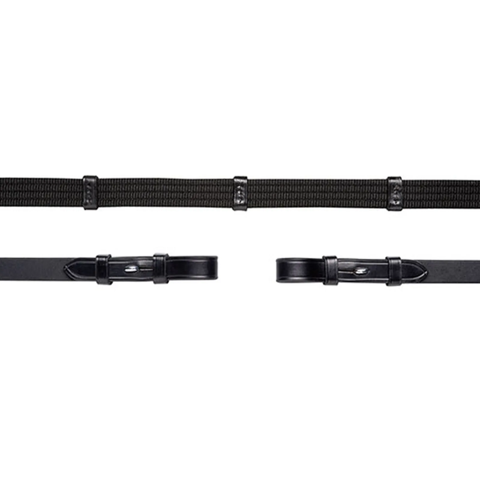 Kangasohjat Kiinnityshakasilla. Ohjissa 5 Ohjasnappylaa Ja Martingaalistopparit. Ohjat Kiinnittyvat Kiinnityskoukuilla.