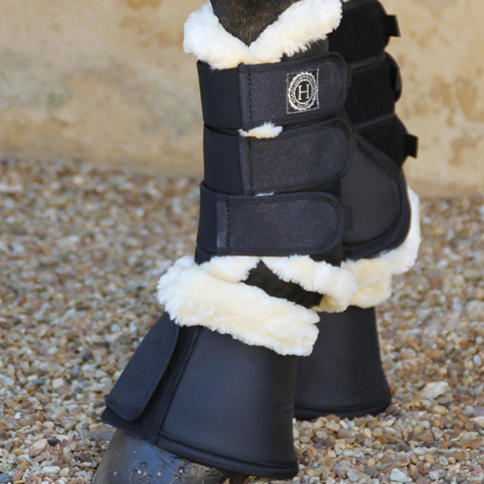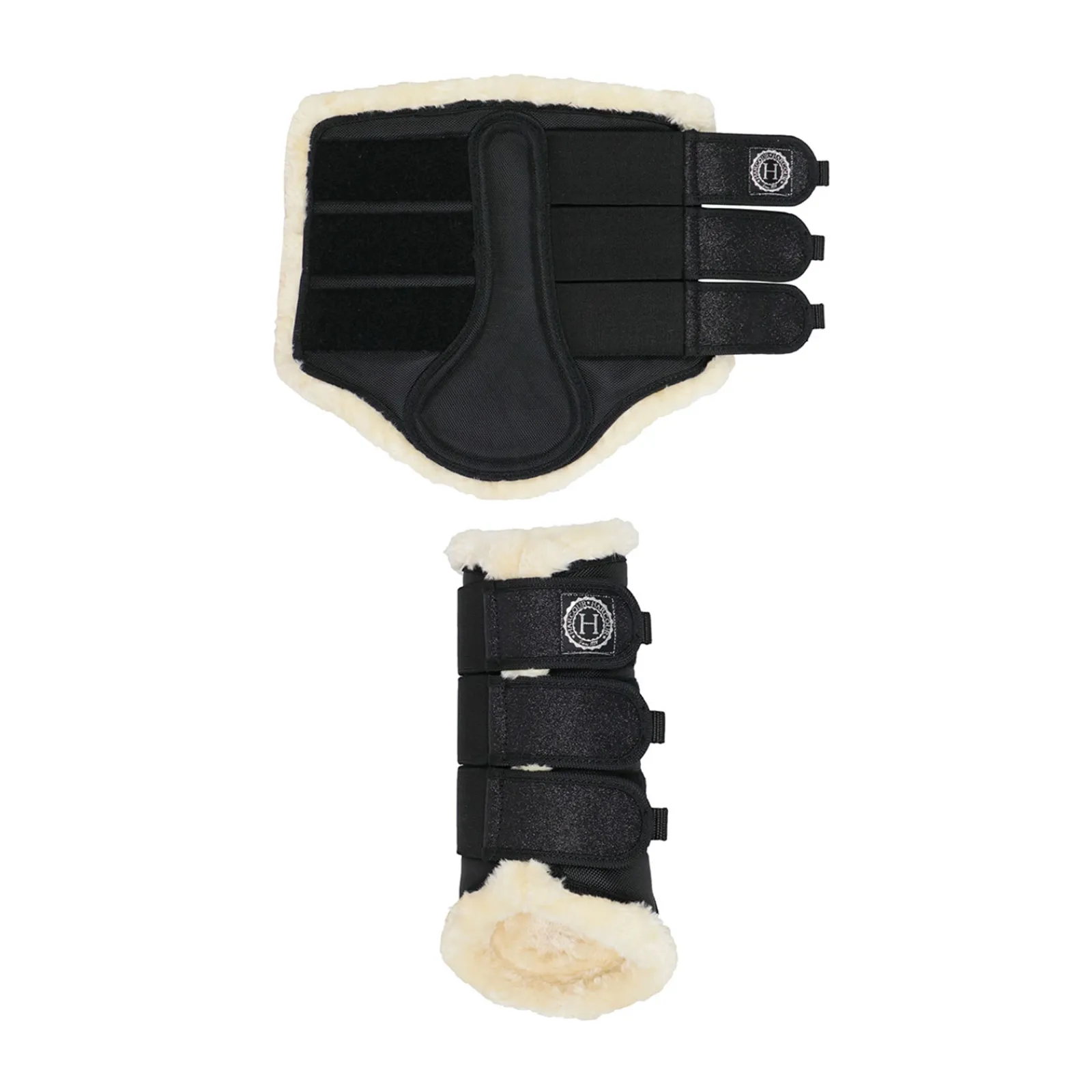 Kahden Kappaleen Setti Suojaavia, Miellyttavia Ja Hengittavia Harcour Jannesuojia.Elainten Oikeuksia Kunnioittavaa Keinolampaankarvaa.Pintamateriaali 1600 Denieria, Tarrakiinnitykset.Hopeanvarinen Harcour-Logo.