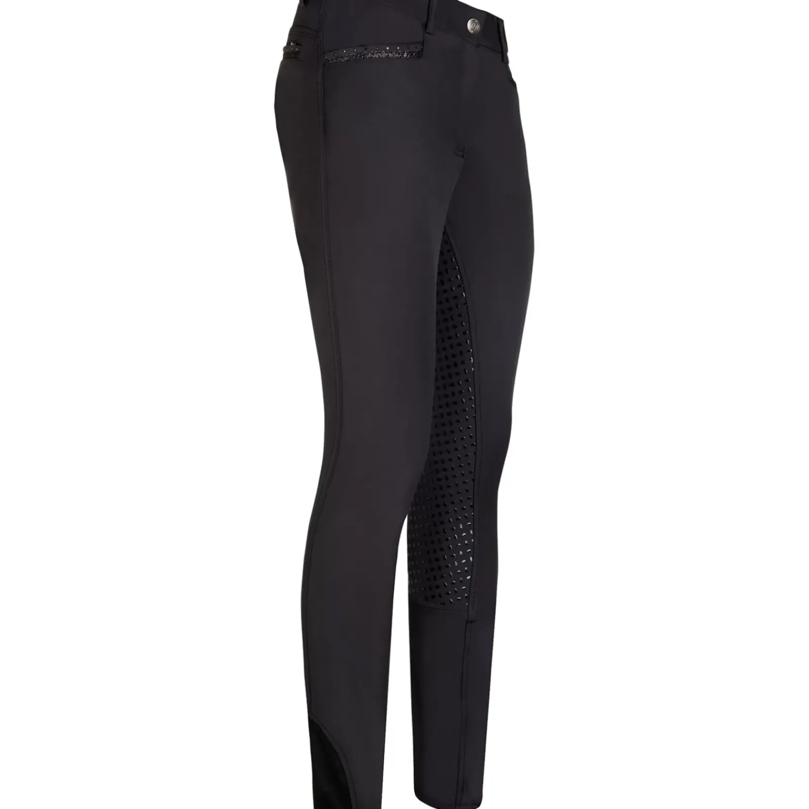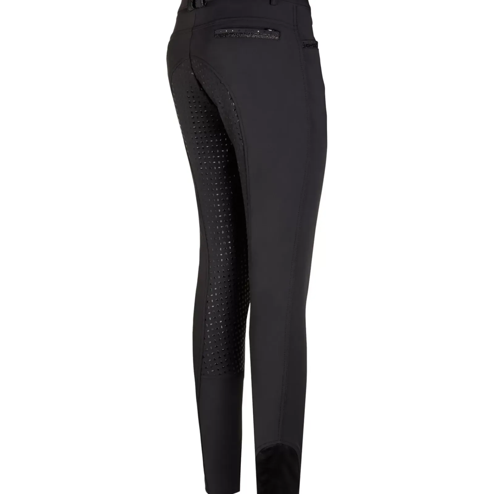 Fancy Breeches With Glitter Foil Print Details At Front- And Backpockets And On Back Beltloops. Rhinestones Along Front- And Backpocket. Logo Glitter Foil Print On Front Leg. With Silicone Fullseat.
